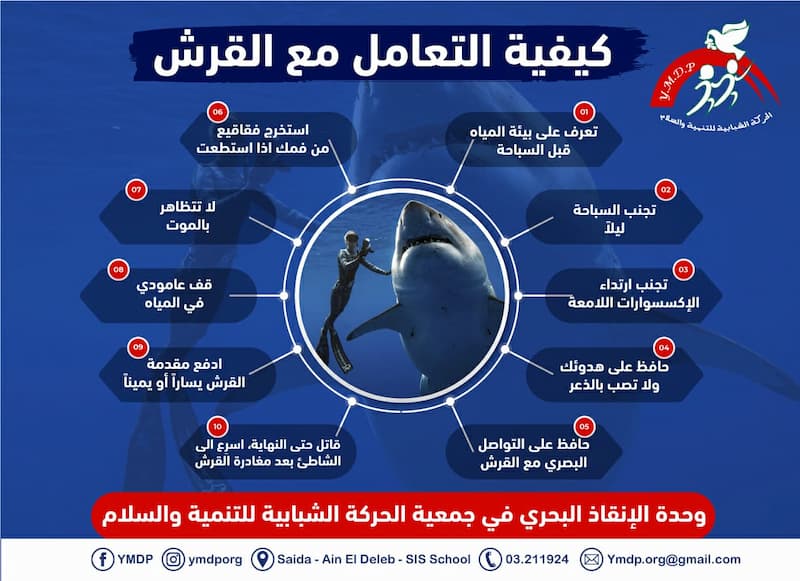 بعد الحادثة الأخيرة التي حصلت في منطقة الغردقة في مصر عن هجوم قرش لشاب روسي، وحدة الانقاذ البحري التابعة لجمعية الحركة الشبابية للتنمية والسلام توجه ارشاداتها لكيفية التعامل مع القرش.