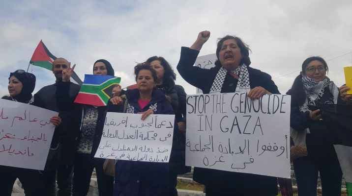 جنوب أفريقيا، حضرت إلى صيدا بوقفة دعم وشكر على قيامها برفع دعوى جنائية في محكمة العدل الدولية في لاهاي ضدّ إسرائيل لارتكابها إبادة جماعية في غزة، وهي الأولى في لبنان وتميّزت بأنها رمزية ولكنها نسائية بامتياز، تزامناً مع استمرار جلساتها. الوقفة التي نظّمت عند ساحة النجمة، وسط مدينة صيدا، رفعت عشرات المشاركات فيها من اللبنانيات والفلسطينيات لافتات باللغتين العربية والإنكليزية، تشكر جنوب أفريقيا، وتدعو إلى معاقبة إسرائيل على جرائمها ومجازرها ووقف العدوان على غزة فوراً. وقالت الناشطة اللبنانية ثريا هاشم وهي تهتف «فلسطين حرّة حرّة... والصهيوني اطلع برّا»: «إن إسرائيل داست كل حقوق الإنسان والأطفال والمرأة تحت أقدامها ونحن نستنكر ما يتعرّض له أبناء غزة وأطفالها من حرب إبادة جماعية وندعو إلى وقفها فوراً ومحاسبة إسرائيل»، وحيّت «تضحيات المقاومين في غزة ولبنان التي ستصنع النصر قريباً».