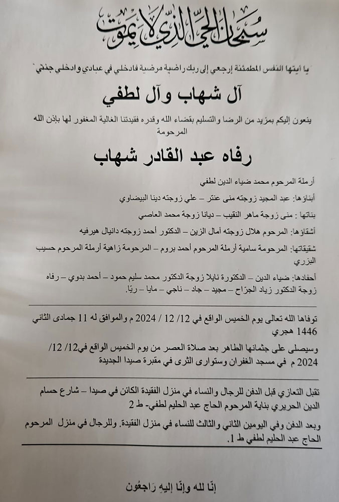 رفاه عبد القادر شهاب (أرملة محمد لطفي) في ذمة الله