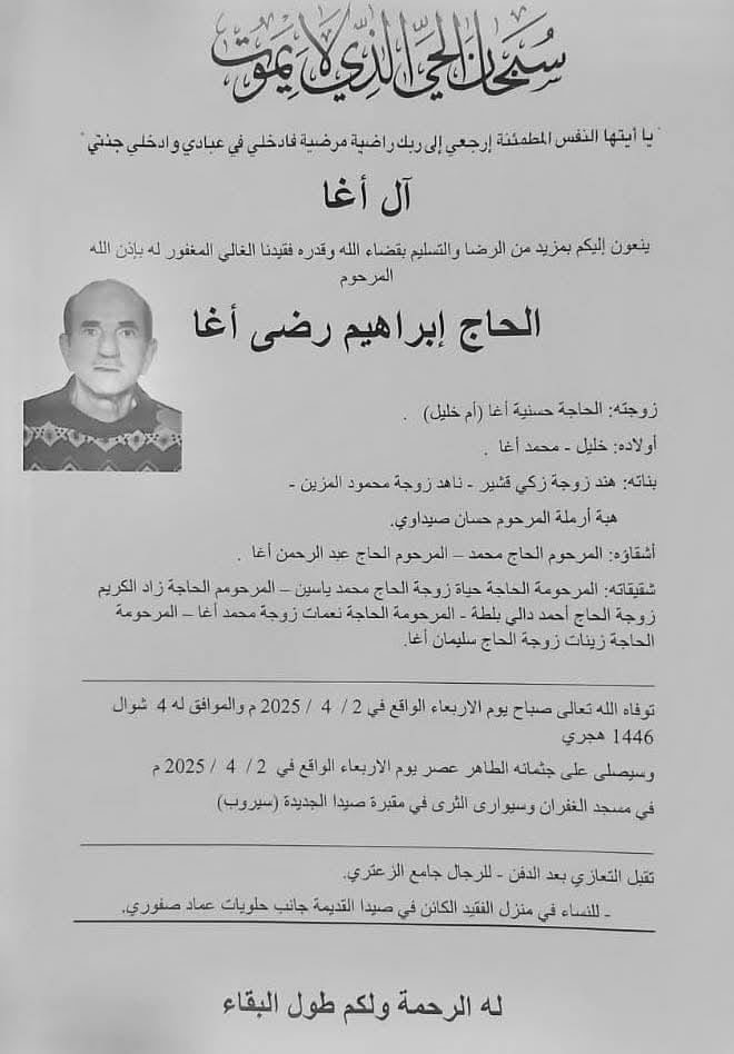 الحاج إبراهيم رضى أغا في ذمة الله
