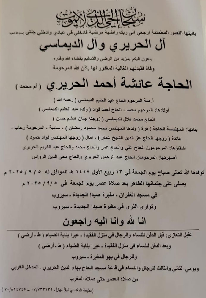 الحاجة عائشة أحمد الحريري (أم محمد - أرملة الحاج عبد الحليم الديماسي) في ذمة الله