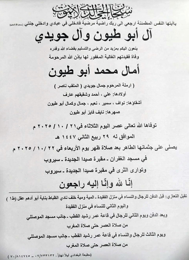 أمال محمد أبو طيون (أرملة جمال جويدي الملقب ناصر) في ذمة الله
