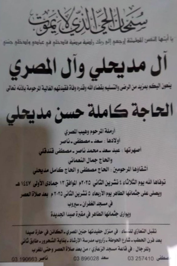 الحاجة كاملة حسن مديحلي (أرملة وهيب المصري) في ذمة الله