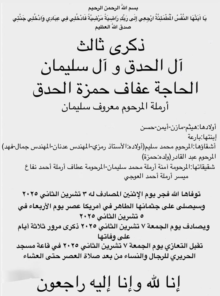الحاجة عفاف حمزة الحدق (أرملة معروف سليمان) في ذمة الله