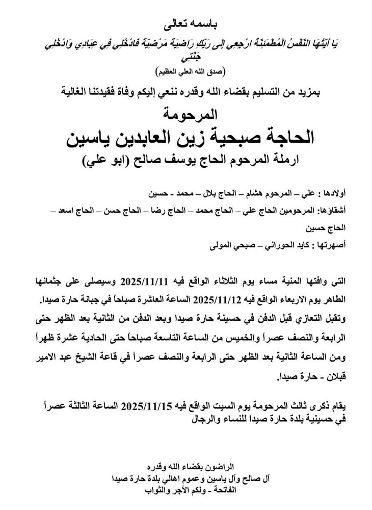الحاجة صبحية زين العابدين ياسين (أرملة الحاج يوسف صالح - أبو علي) في ذمة الله