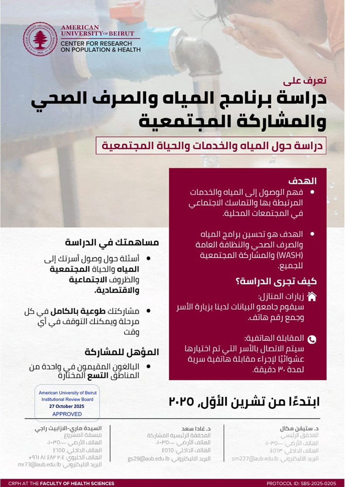 يدعو فريق AUB سكان منطقة دلاعة بشكل خاص إلى التعاون والمشاركة في هذه الدراسة التي انطلقت فعلياً اعتباراً من تشرين الأول 2025.