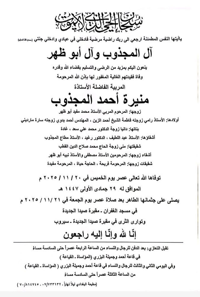 المربية الفاضلة الأستاذة منيرة أحمد المجذوب (أرملة المربي الأستاذ محمد مفيد أبو ظهر) في ذمة الله