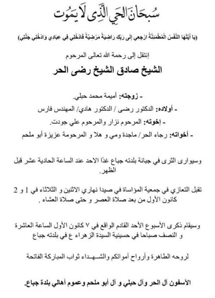 الشيخ صادق الشيخ رضى الحر (زوجته أميمة حبلي) في ذمة الله