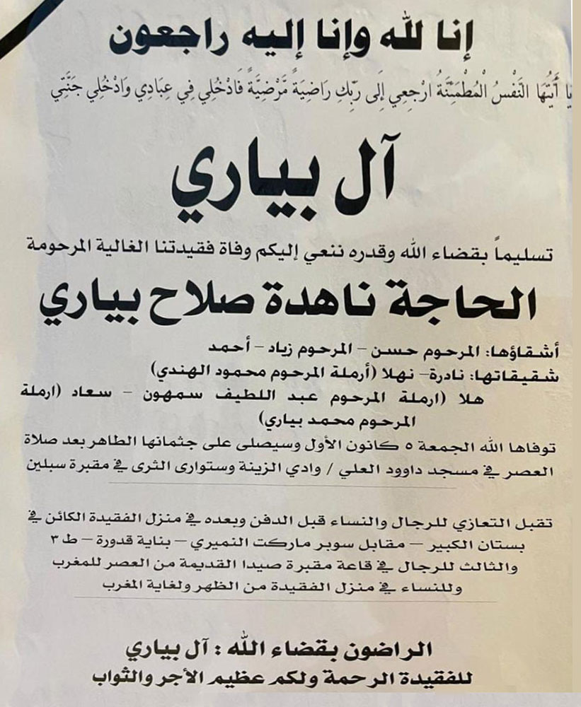 المربية الفاضلة الحاجة سهيلة محمد منياتو (أرملة الحاج مصطفى صفدية) في ذمة الله