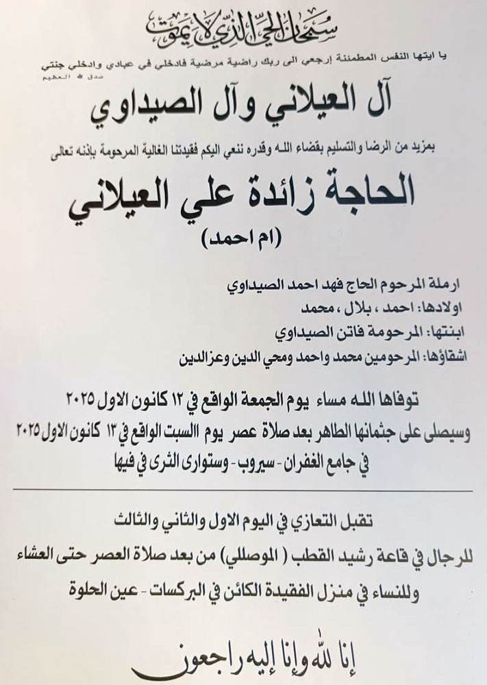الحاجة زائدة علي العيلاني (أم أحمد - أرملة الحاج فهد الصيداوي) في ذمة الله