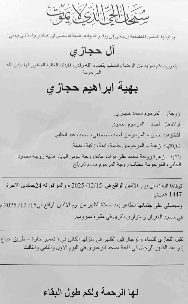 بهية إبراهيم حجازي (أرملة محمد حجازي) في ذمة الله