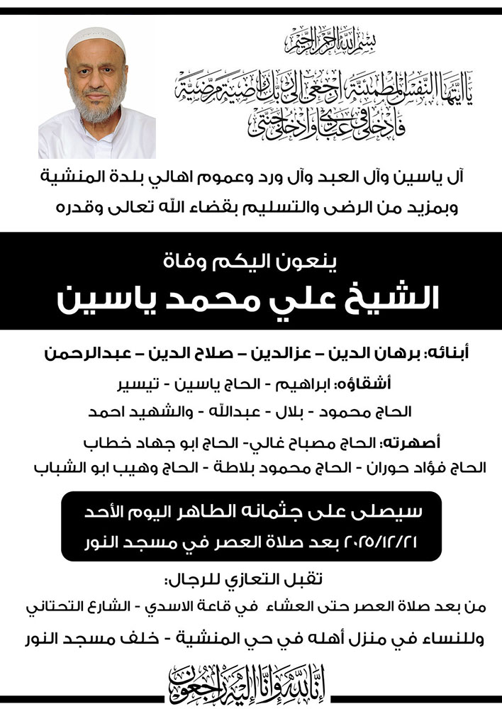 & ينعونَ إليكم وفاةَ الشَّيخ علي محمَّد ياسين - أبو برهان من بلدة المنشيَّة.
