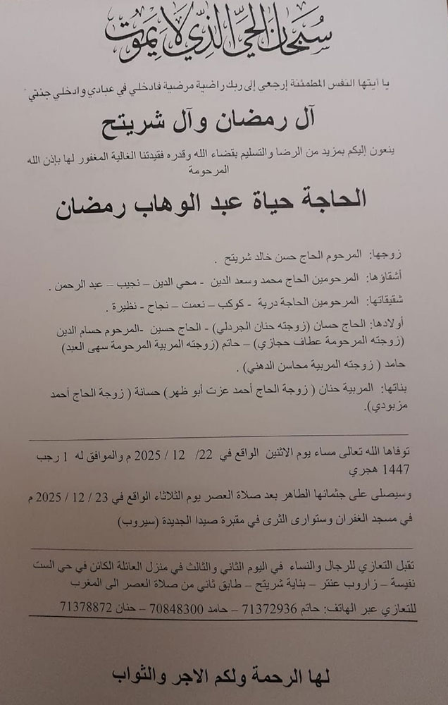الحاجة حياة عبد الوهاب رمضان (أرملة الحاج حسن شريتح) في ذمة الله