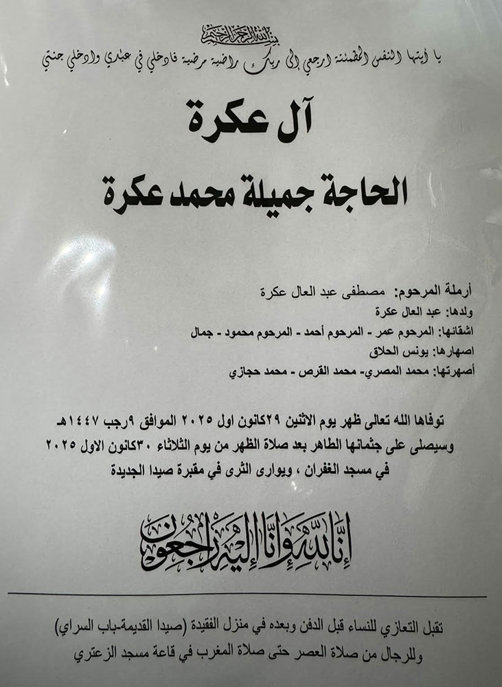 الحاجة جميلة محمد عكرة (أرملة مصطفى عكرة) في ذمة الله