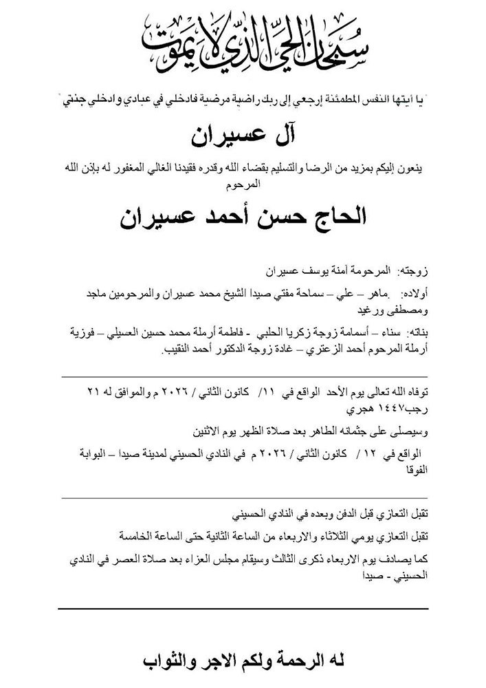 الحاج حسن أحمد عسيران (والد المفتي الشيخ محمد عسيران) في ذمة الله