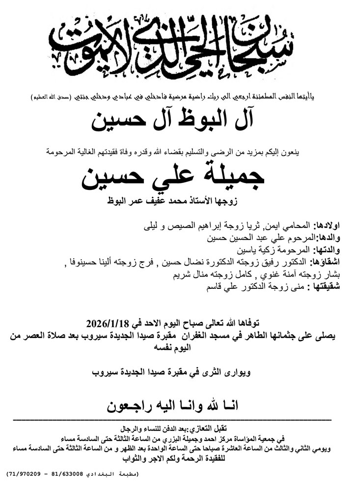 جميلة علي حسين (زوجها الأستاذ محمد عفيف البوظ) في ذمة الله
