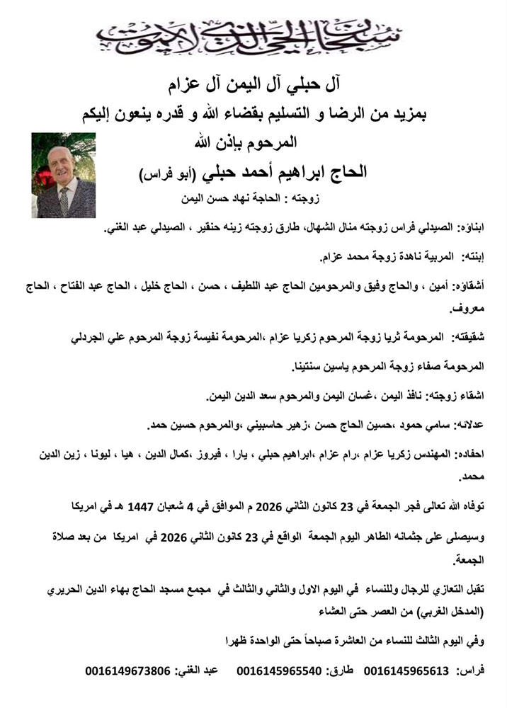 الحاج إبراهيم أحمد حبلي (أبو فراس) في ذمة الله