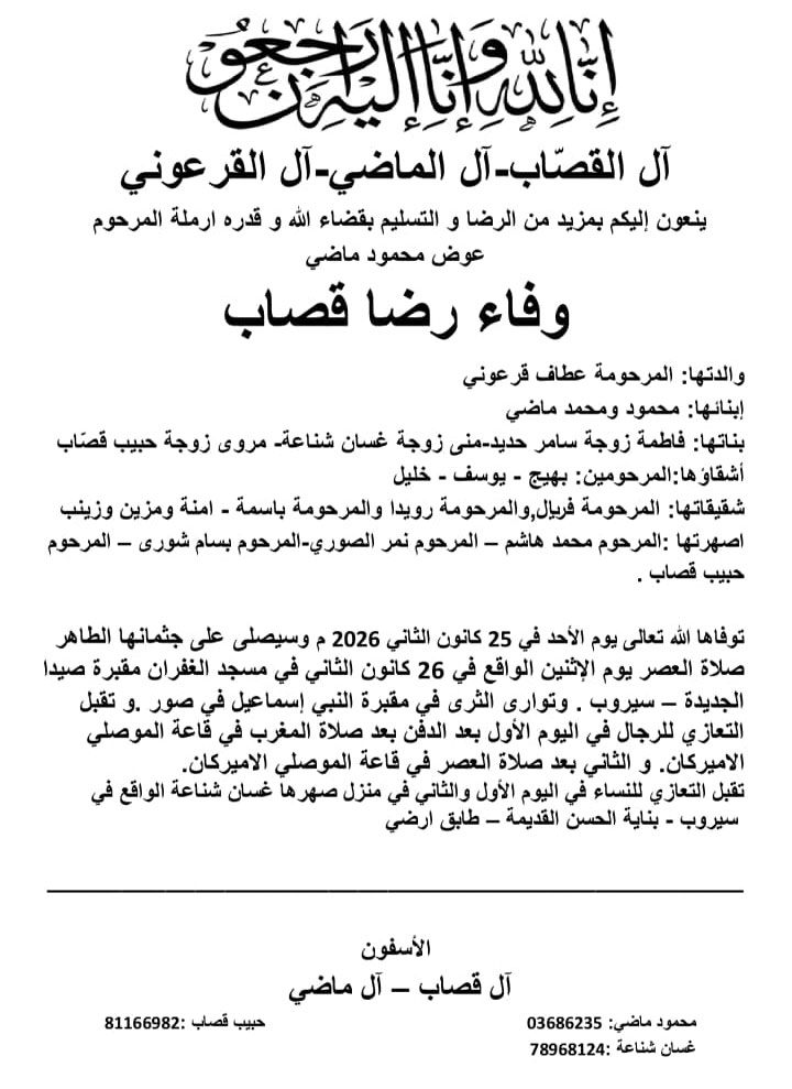 وفاء رضا قصاب (أرملة عوض ماضي) في ذمة الله