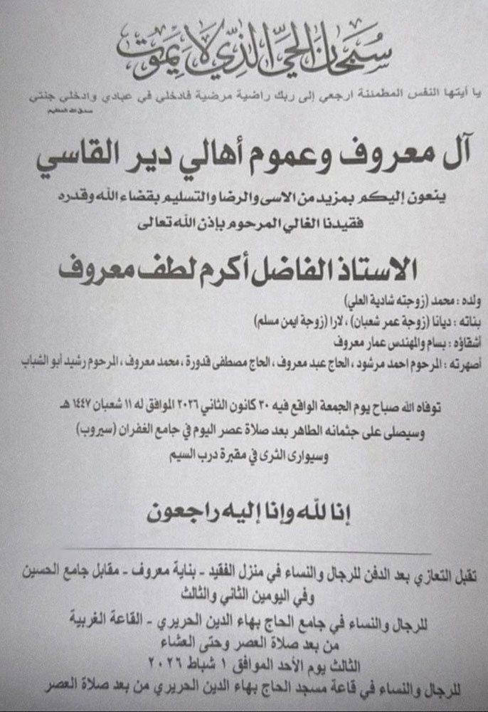الأستاذ الفاضل أكرم لطف معروف في ذمة الله