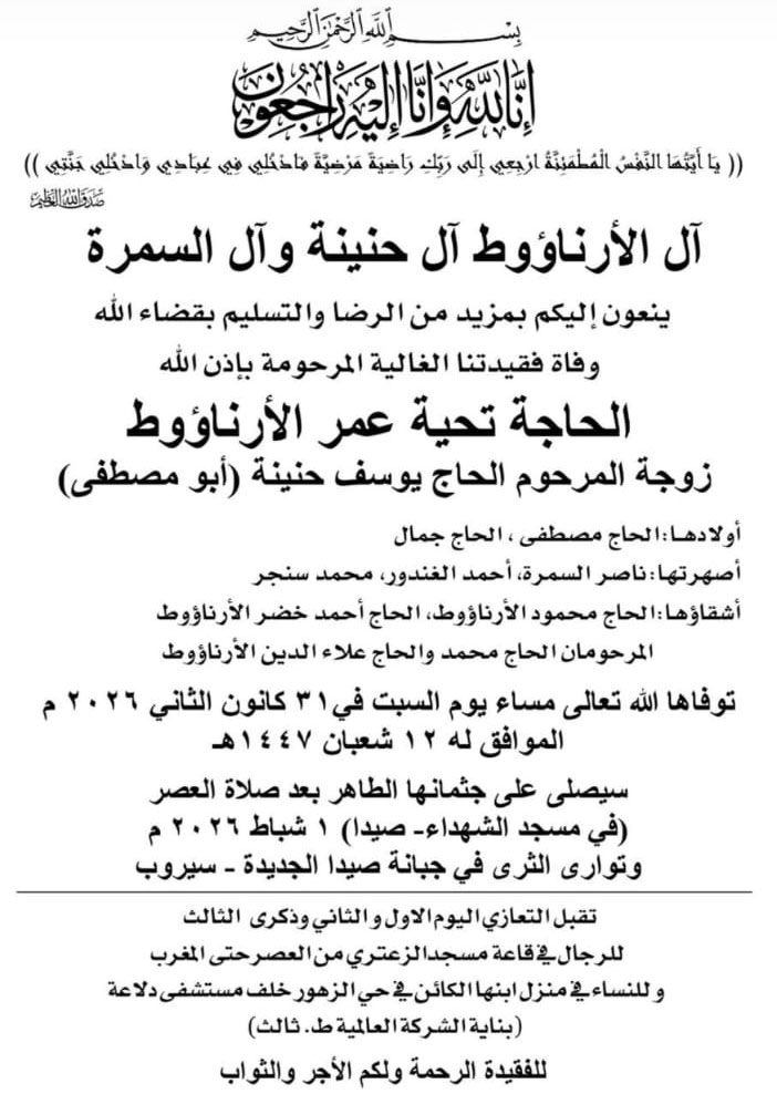 الحاجة تحية عمر الأرناؤوط (أرملة الحاج يوسف حنينة - أبو مصطفى) في ذمة الله