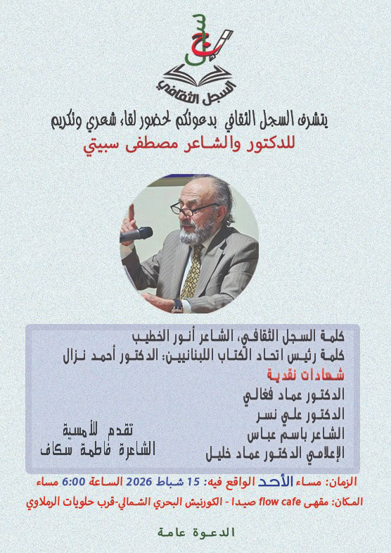السجل الثقافي يدعوكم إلى لقاء شعري وتكريم الدكتور والشاعر مصطفى سبيتي
