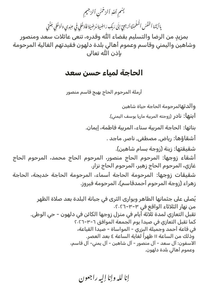 الحاجة لمياء حسن سعد (أرملة الحاج بهيج منصور) في ذمة الله