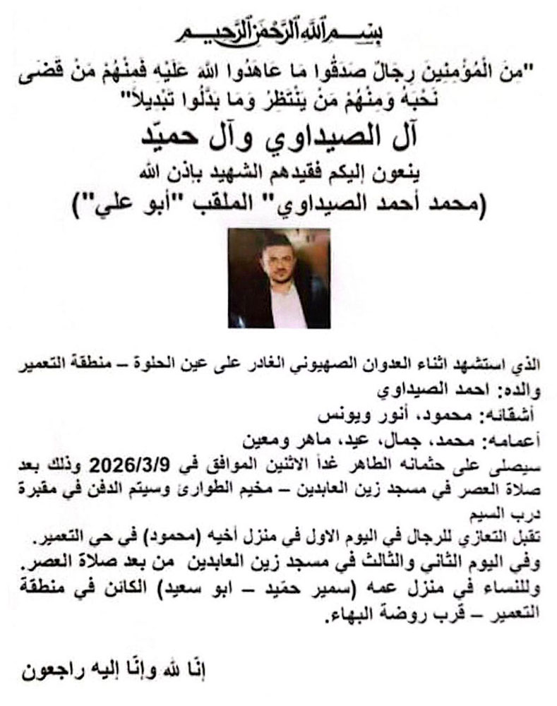 الشهيد محمد أحمد الصيداوي (الملقب أبو علي) في ذمة الله