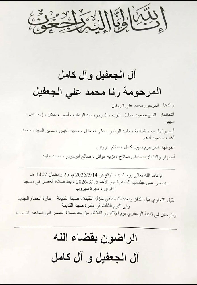 زينة مصطفى أيوب الشريف (زوجة محمد حبلي) في ذمة الله