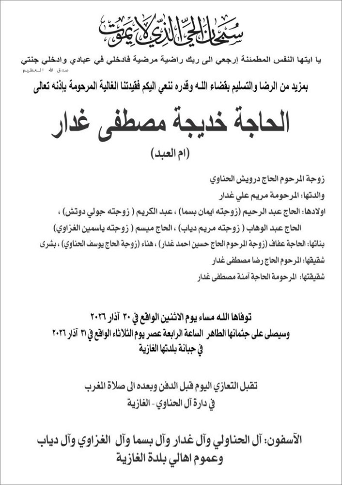 الحاجة خديجة مصطفى غدار (أم العبد - أرملة الحاج درويش الحناوي) في ذمة الله