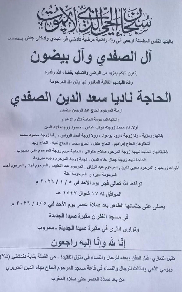 الحاجة ناديا سعد الدين الصفدي (أرملة الحاج عبد الرحمن بيضون) في ذمة الله