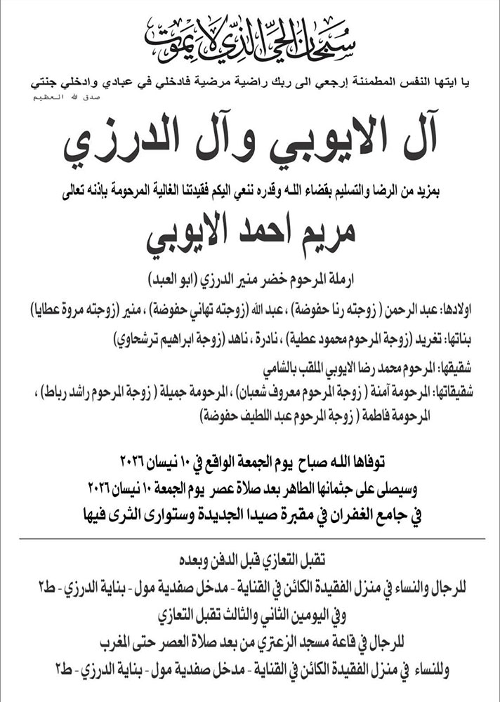 مريم أحمد الأيوبي (أرملة خضر الدرزي - أبو العبد) في ذمة الله