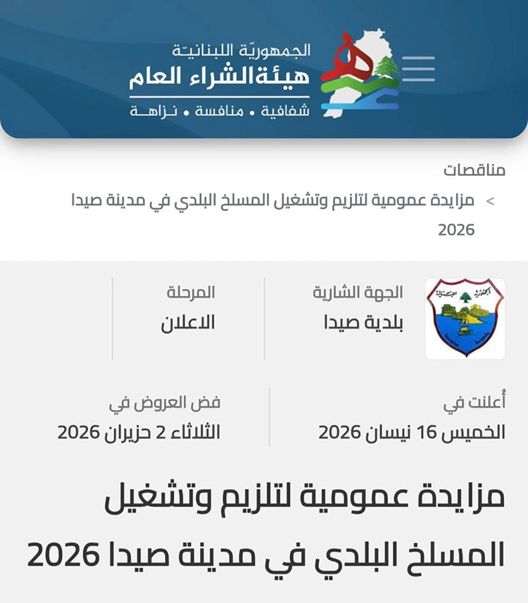 بناء عليه، تدعو بلدية صيدا كافة الشركات المتخصصة والراغبة في المشاركة بهذه المزايدة، بوجوب الاطلاع على كافة التفاصيل والشروط وتحميل المستندات المطلوبة عبر زيارة الرابط المخصص لهذه المناقصة على الموقع الإلكتروني الرسمي لهيئة الشراء العام من خلال الرابط التالي: