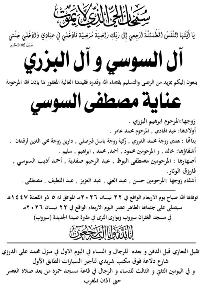 عناية مصطفى السوسي (أرملة إبراهيم البزري) في ذمة الله