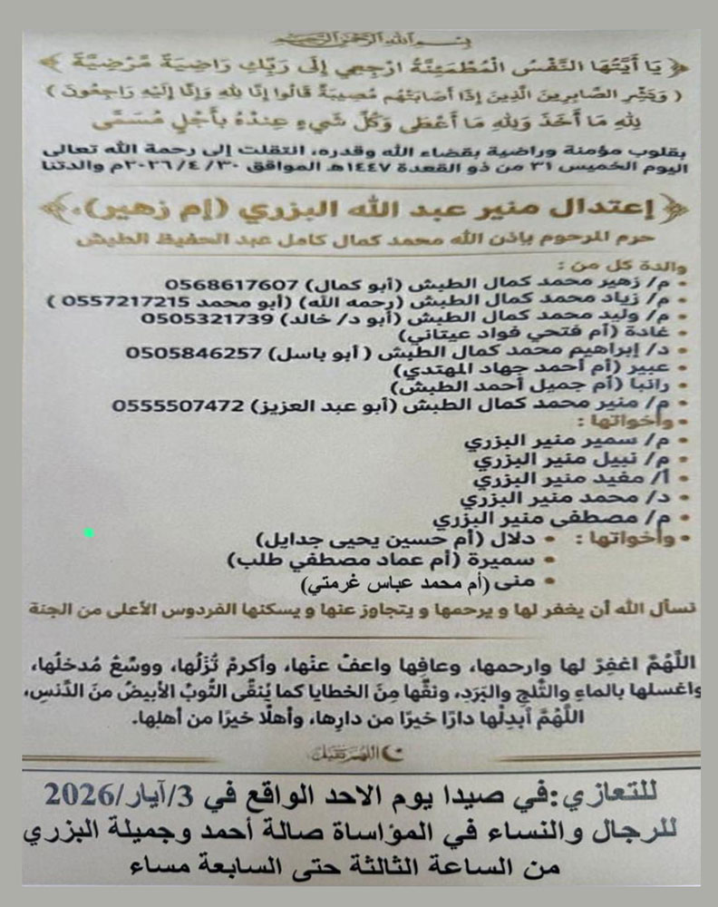 إعتدال منير عبد الله البزري (أم زهير - أرملة محمد كمال الطبش) في ذمة الله